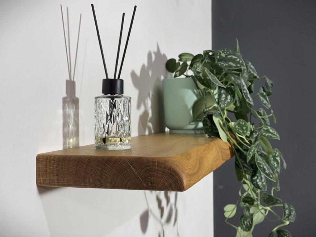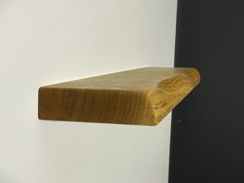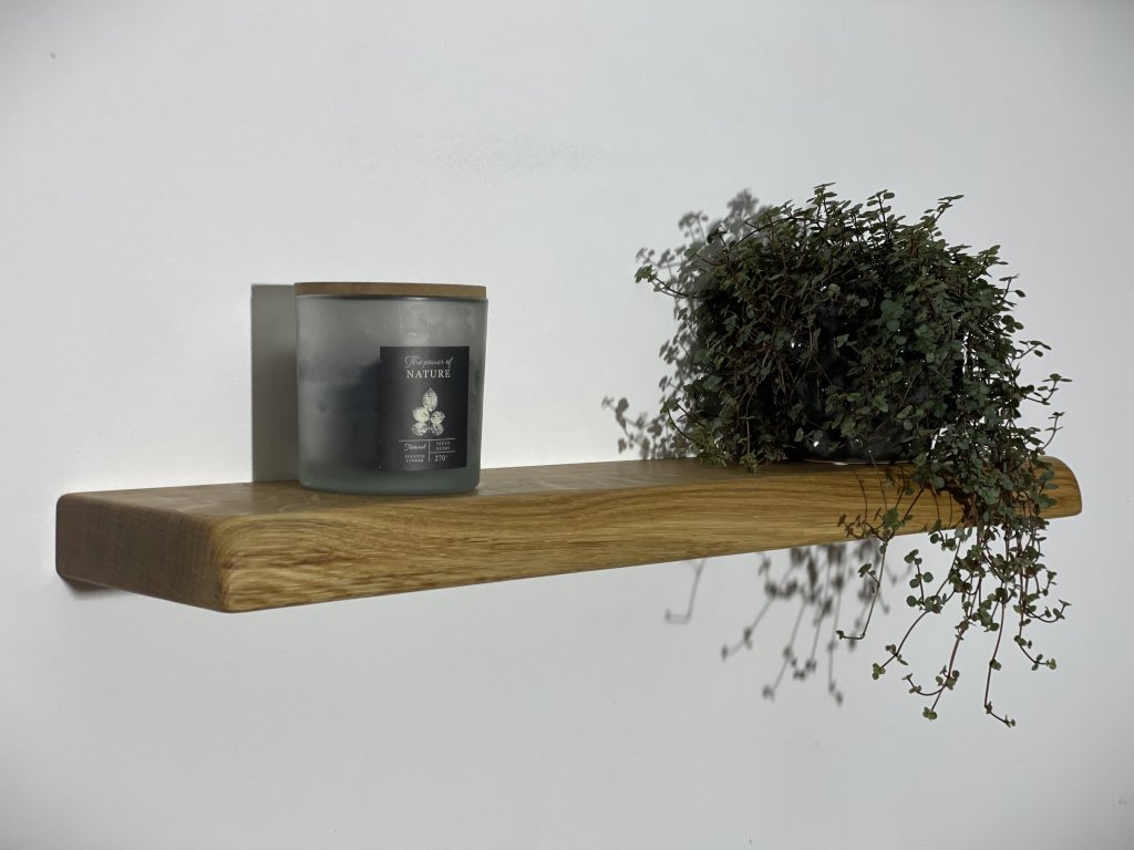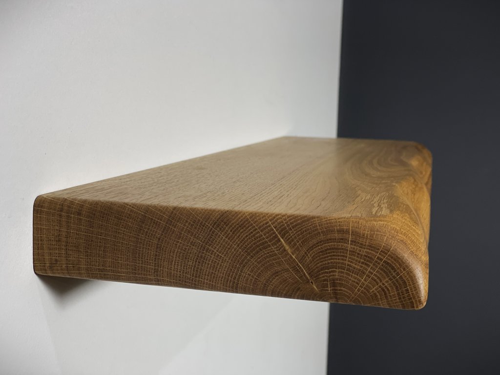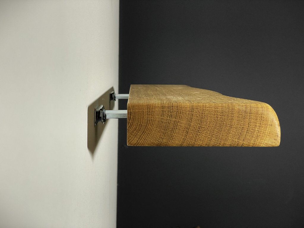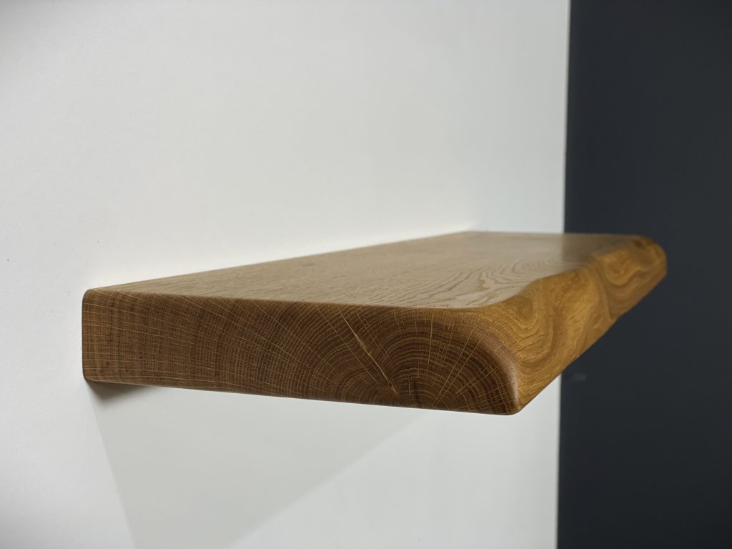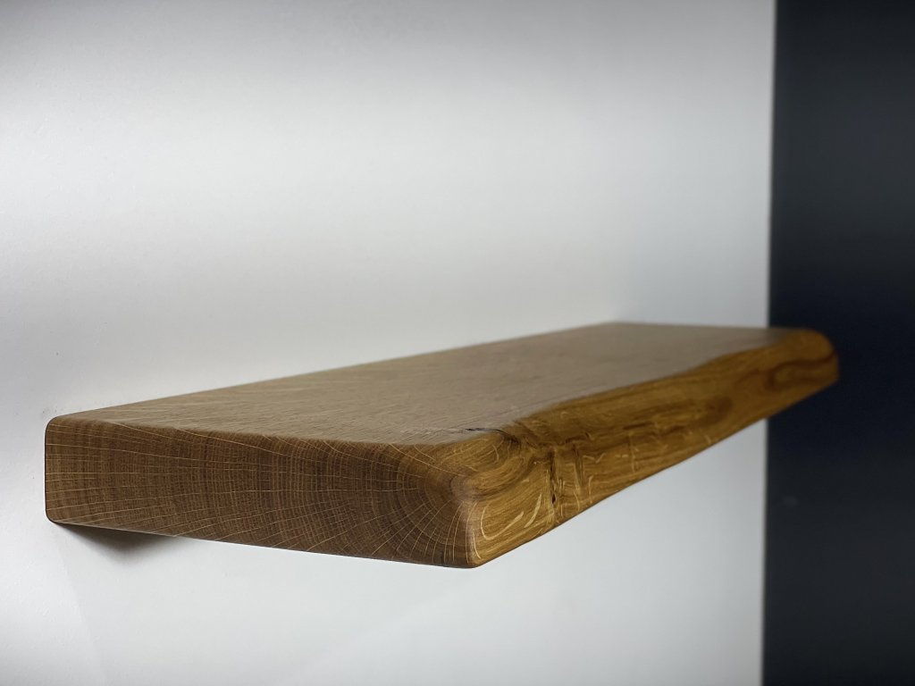 Dubová police s přírodní hranou se skrytým kováním.