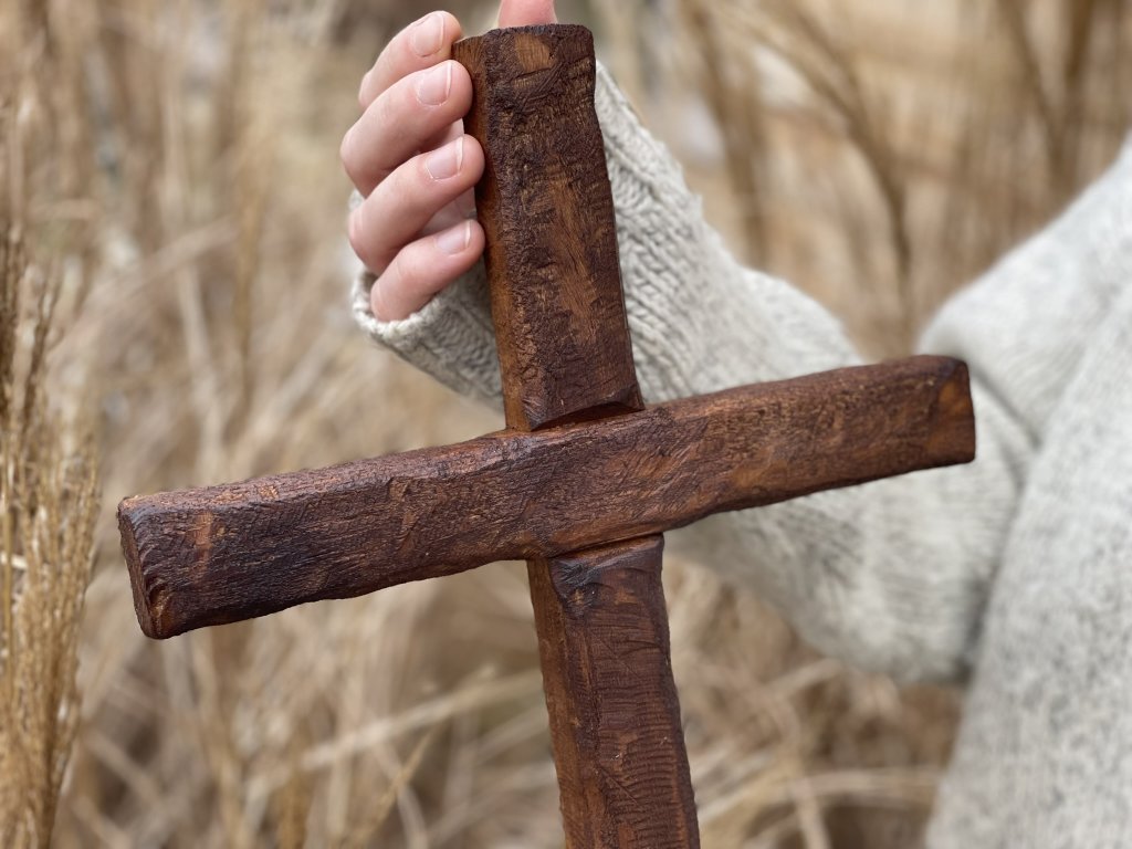 Ručně vyrobený kříž k zavěšení z jasanového dřeva , hrubě opracovaný.