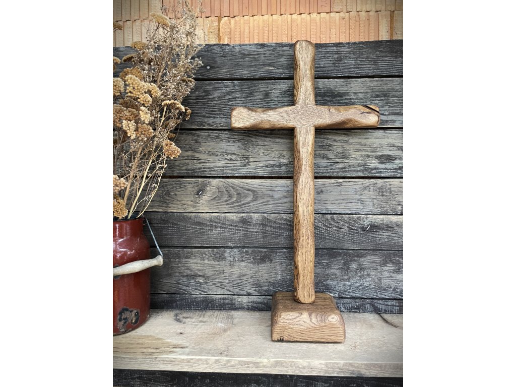 Rozměry: Výška kříže 50 cm, šířka 28 cm a síla 2,5 cm. Podstavec 13x13, výška 4,5 cm. Celková výška 54,5 cm.