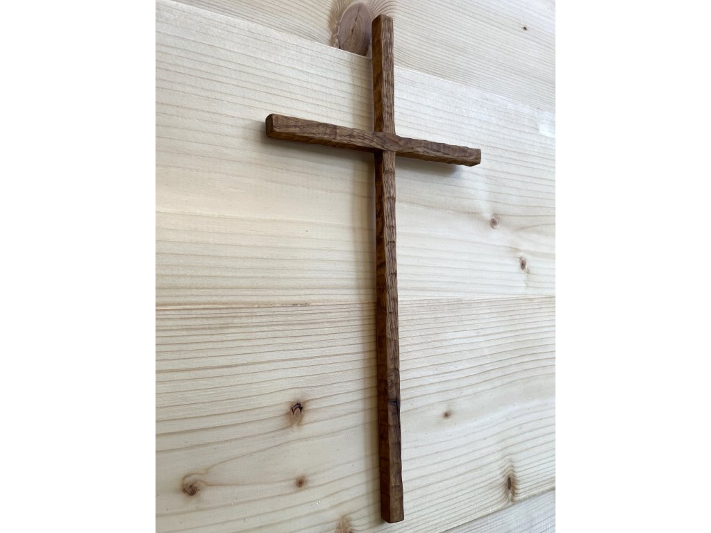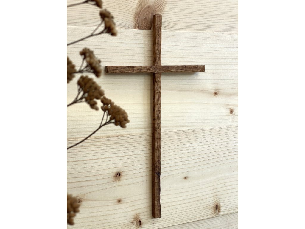 Kříž k zavěšení z dubového dřeva s vrypy.