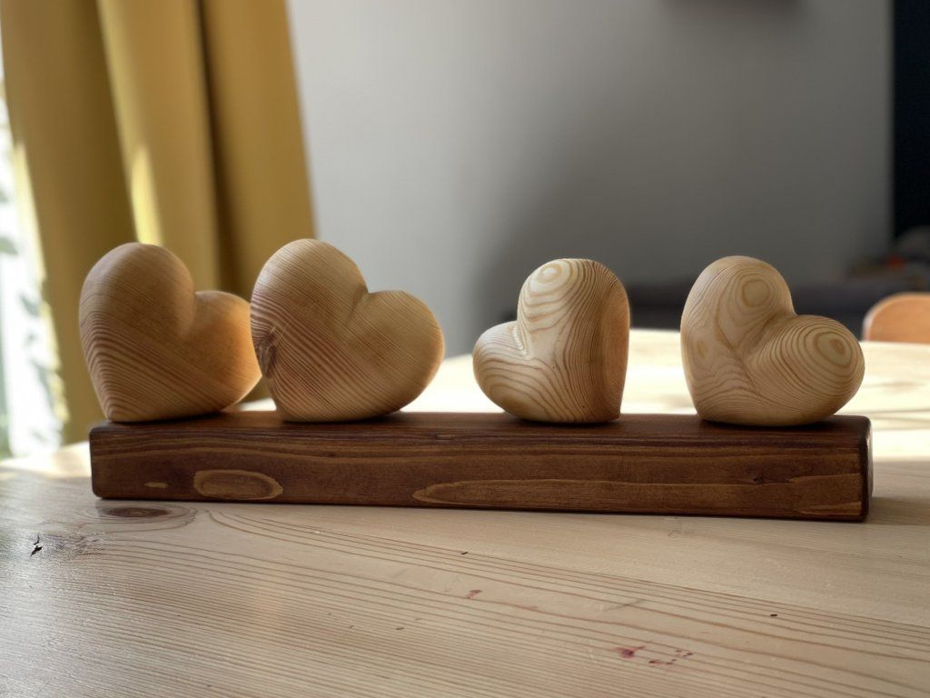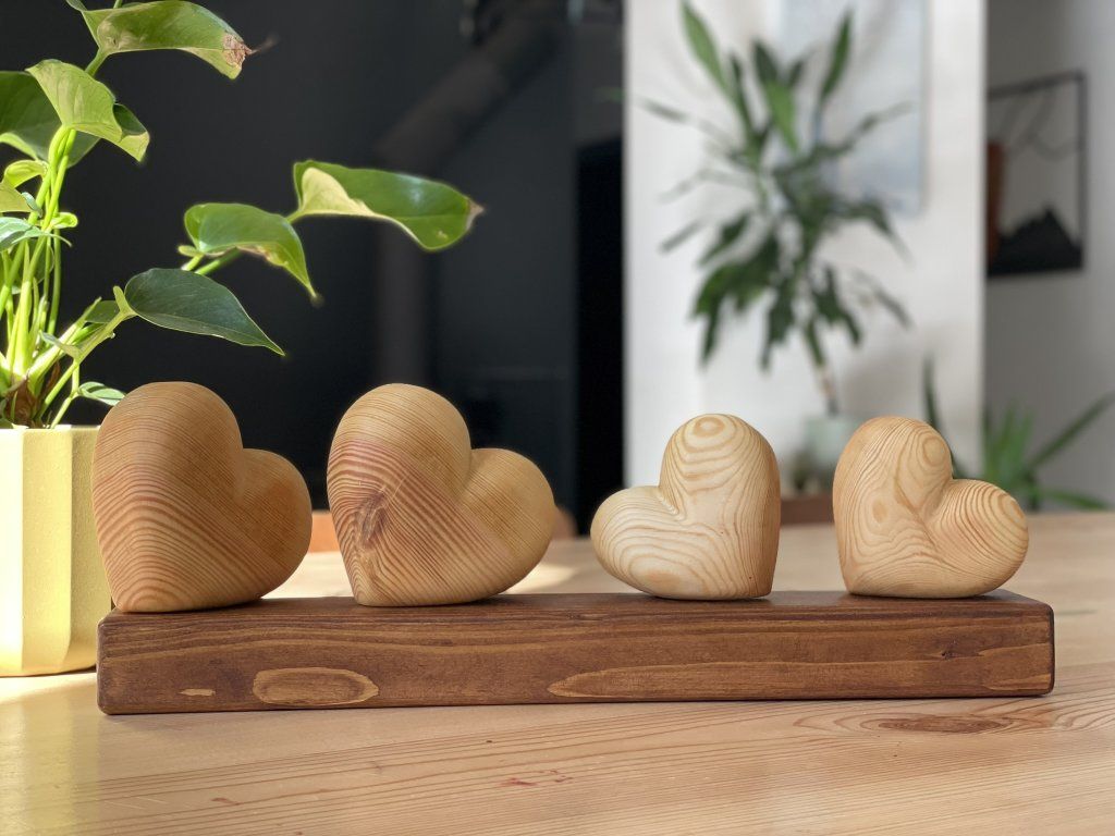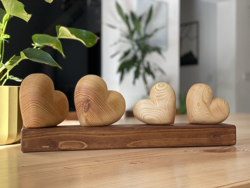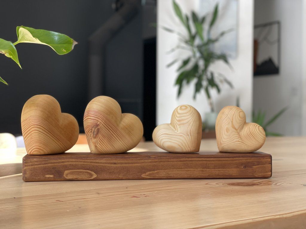 Dřevěné srdce – symbol rodiny ❤️ - Čtyři srdíčka na podstavci